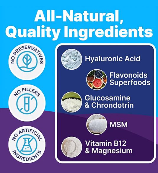 It delivers clinically dosed Hyaluronic Acid, MSM, Glucosamine, BioFlavonoids, and more to: